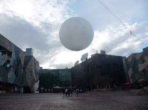 Let me set the scene. Early morning. Patently crisp, fragrant, autumnal Melbourne air. Jostling, shoulder-to-shoulder with my fellow commuters, I emerge, blinking mole-like from the bowels of Flinders Street station, momentarily blinded by the morning glare. Look east, towards the expanse of the Fed Square forecourt, convinced my retina has finally thrown in the towel and detached itself from whatever it is that it’s supposed to be attached to. BUT WAIT! That’s not a piece of optical tissue floating around inside my eyeball. It’s SOMETHING HOVERING OVER FED SQUARE. A very big, round something. Apparently tethered to the buildings around the plaza with giant dog leads.