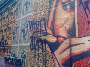 And so, another instalment in my series of poor-quality photos – this time taken in the rain with my phone. But, I couldn’t help myself. Until Never (the gallery) is running an exhibition of noted American street artist Shepard Fairey’s work at the moment, and the wall that leads from the corner of Hosier Lane to the gallery’s entrance is completely plastered with a veritable gallery of Fairey’s most iconic images. It’s quite a sight to see.