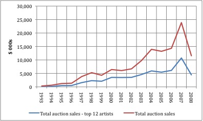 There is no question that a number of Aboriginal artists have achieved significant levels of fame and material success. Emily Kame Kngwarreye, Clifford Possum Tjapaltjarri, and Rover Thomas amongst others have become superstars in the economic sense of the word; they are responsible for generating the lion’s share of revenue in the marketplace (Rosen, 1981; De Vany, 2004). But although the superstar phenomenon is common to the art auction market in general, it is amplified in the Aboriginal art sector. This indicates that demand for the small number of artists at the top of the market is exaggerated relative to the market in general. Figure 1 shows that between 1993 and 2008, sales of art by the twelve highest-selling Aboriginal artists accounted for almost fifty percent of the total amount of Aboriginal art sold at auction. If we expand these figures to include the seventeen top-selling artists, we find that between them they generated sixty-six percent of auction sales of Aboriginal art between 1997 and 2008 (Francis, 2006) compared with the seventeen top-selling non-Aboriginal Australian contemporary artists who were responsible for thirty-two percent of sales in their sector (De Marchi & Meaghan Wilson-Anastasios, 2009).