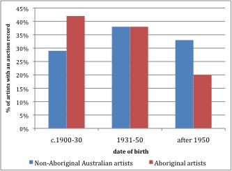 Figure 2 compares the relative ages of artists in the non-Indigenous contemporary Australian and the Aboriginal art auction markets. The proportion of artists in the contemporary sector born after 1950 is 33%, compared with 20% of the Aboriginal artists; the figures are reversed at the other end of the scale, with 42% of the Aboriginal artists in the survey born between 1900 and 1930, compared with 29% of the non-Indigenous Australian artists. This is what we would expect to see if there was much higher demand for works of art by the earliest generation of Aboriginal artists and reduced demand for work by emerging painters.