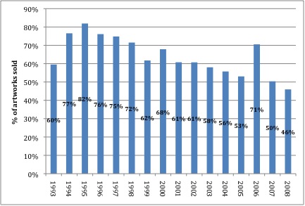 When the declining clearance rates are considered in light of the sales figures presented in figure 1, it shows that during this period of time, buyers were competing more aggressively for an ever-decreasing number of significant paintings by the most senior Aboriginal artists. Between 1998 and 2008 a total of about 250 works by these artists appeared at auction annually; although the number of works offered for sale remained constant, as shown in figure 3 clearance rates dropped steadily each year. And yet over the same period, the total revenue generated at auction by these artists has increased. This means that each year there has been less demand for the work on offer, and that competition amongst buyers has focused on the paintings at the top of the market; more revenue has been generated, but fewer artworks have been sold each year.