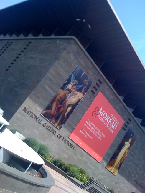 What caused me to pen a response to this was inspired by a visit to the National Gallery of Victoria yesterday. Hanging from the gallery’s façade are two ginormous banners promoting the Gustave Moreau exhibition currently on show (at left – apologies – yet another in my series of embarrassingly bad iPhone photos). Both feature near-naked female figures, not to mention a very young child without any clothing – the child is an infant – many years younger than Barton’s son in the controversial photograph.
