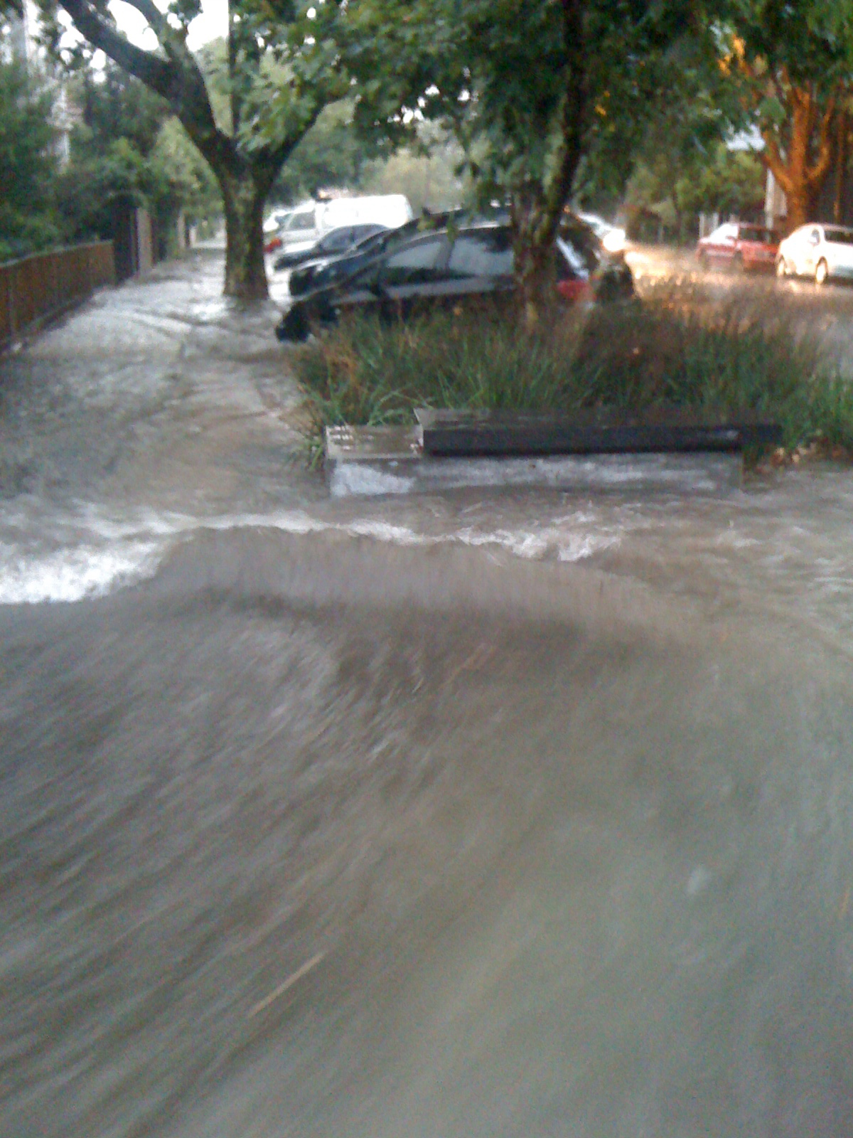 UPDATE: Judging the Postcard show was surprisingly easy. The thought of choosing from 1500 entries, and then having to reach consensus with two other judges was extremely daunting. It was also a blind judging – although we could hazard a guess at who the respective artists were, we were not given the list of artists until after we’d submitted our results. Very refreshing approaching a wall with no preconceptions about the artwork you’re viewing, I must say. When we came together to compare our selections, there were hardly any pieces on our respective shortlists that did not get at least two of the three available votes. Although perhaps our decision caused the gods displeasure. Then again, it could have been the 80s fashioning of dance troupe, Bodyelectric, which entertained the crowds at the collectors’ preview last night. Either way, the heavens opened. Below is a view of Acland Street outside Linden last night. Apocalyptic!