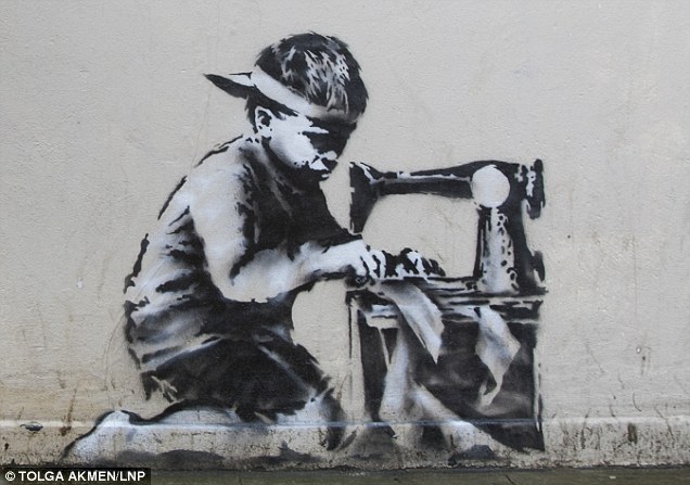 The stencil appeared in London in May 2012. General consensus was that it was a comment on the use of child labour (I remain a stickler for British spelling) in the production of memorabilia for QEII’s Diamond Jubilee. The choice of location was significant. The shop Banksy chose to grace with one of his stencils, Poundland, was at the centre of a scandal in recent years when it was revealed that children as young as seven worked in the Indian factory that produced some of the things being flogged in the store.