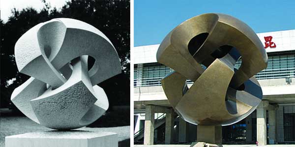 On the left: Claudio Capotondi, ‘Sferosnodo’, 1983. On the right: copy of ‘Sferosnodo’ outside Kunshan station, China. Image via The Art Newspaper (www.theartnewspaper.com)